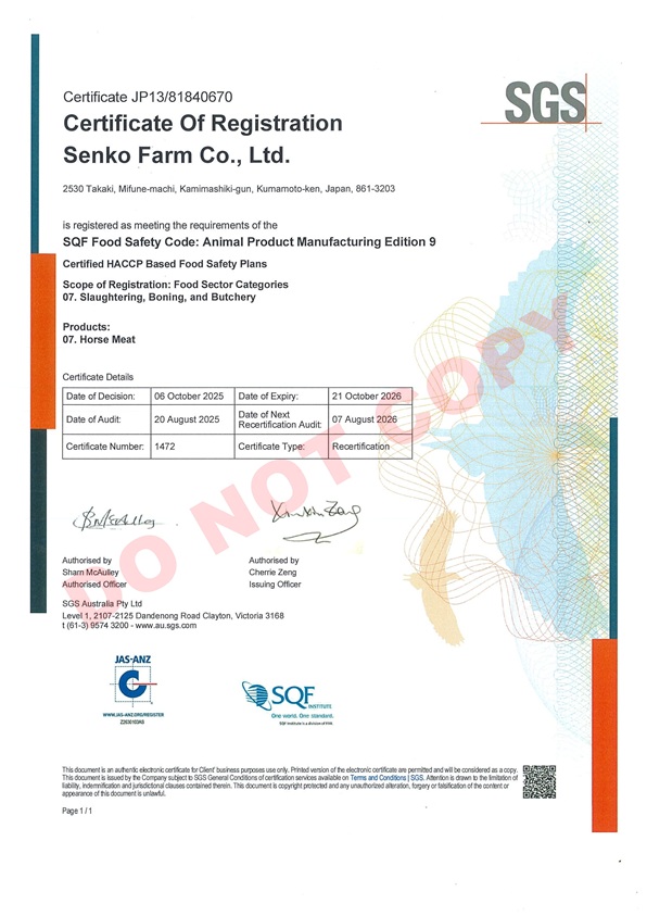 「安全・安心」をお客様へ 世界初 生食用食肉で「SQF」を取得